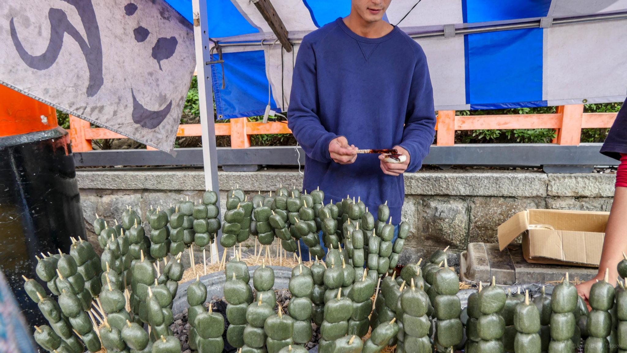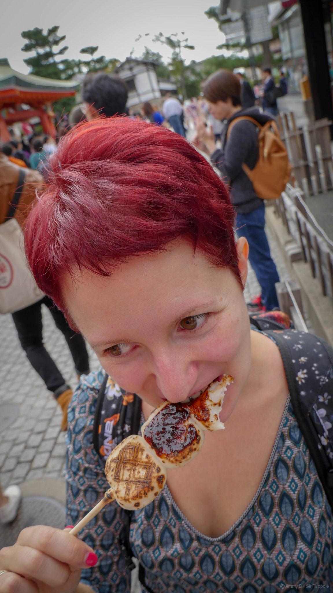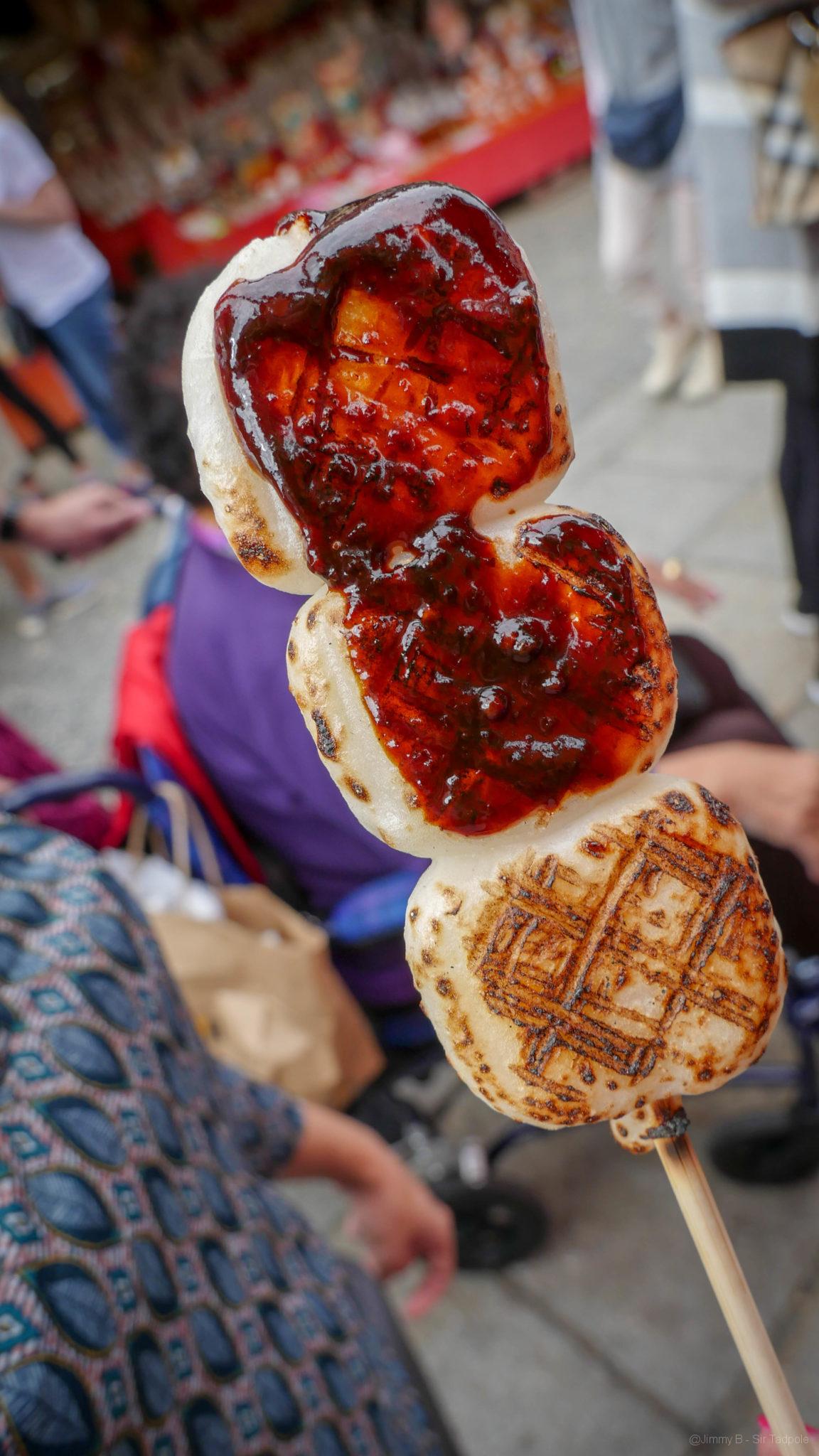 Nous avons arpenté le lieu près de 02:30, montant/descendant les innombrables escaliers, marche après marche. Arriver à l’étape 6 du parcours, les pieds 👣 nous ont dit clairement stop. La dernière boucle fait 40 min et les marches se succèdent encore pour grimper au sommet. Alors nous rebroussons chemin pour regagner le bas du lieu, où une ruelle pleine d’échoppes de nourritures typiques et de boutiques touristiques nous attendent. Nous goûtons une brochette de dango mochi à la sauce miso, friandise de Kyoto, avant de poursuivre nos emplettes. La journée se termine par une bonne sieste, on en avait besoin !