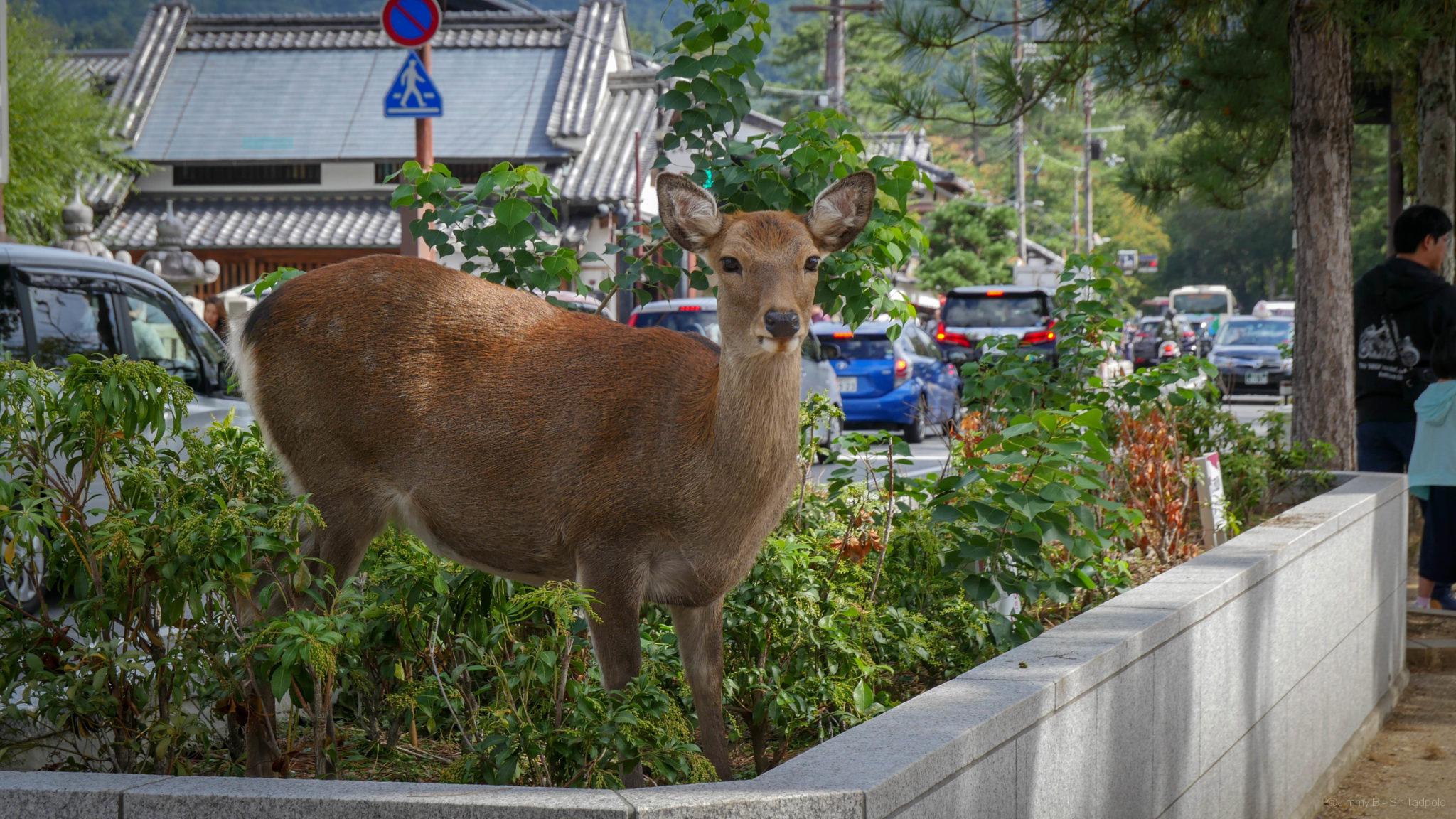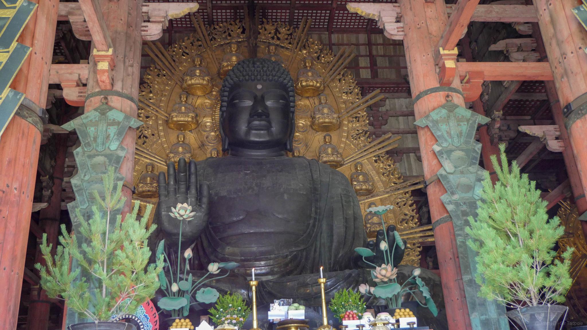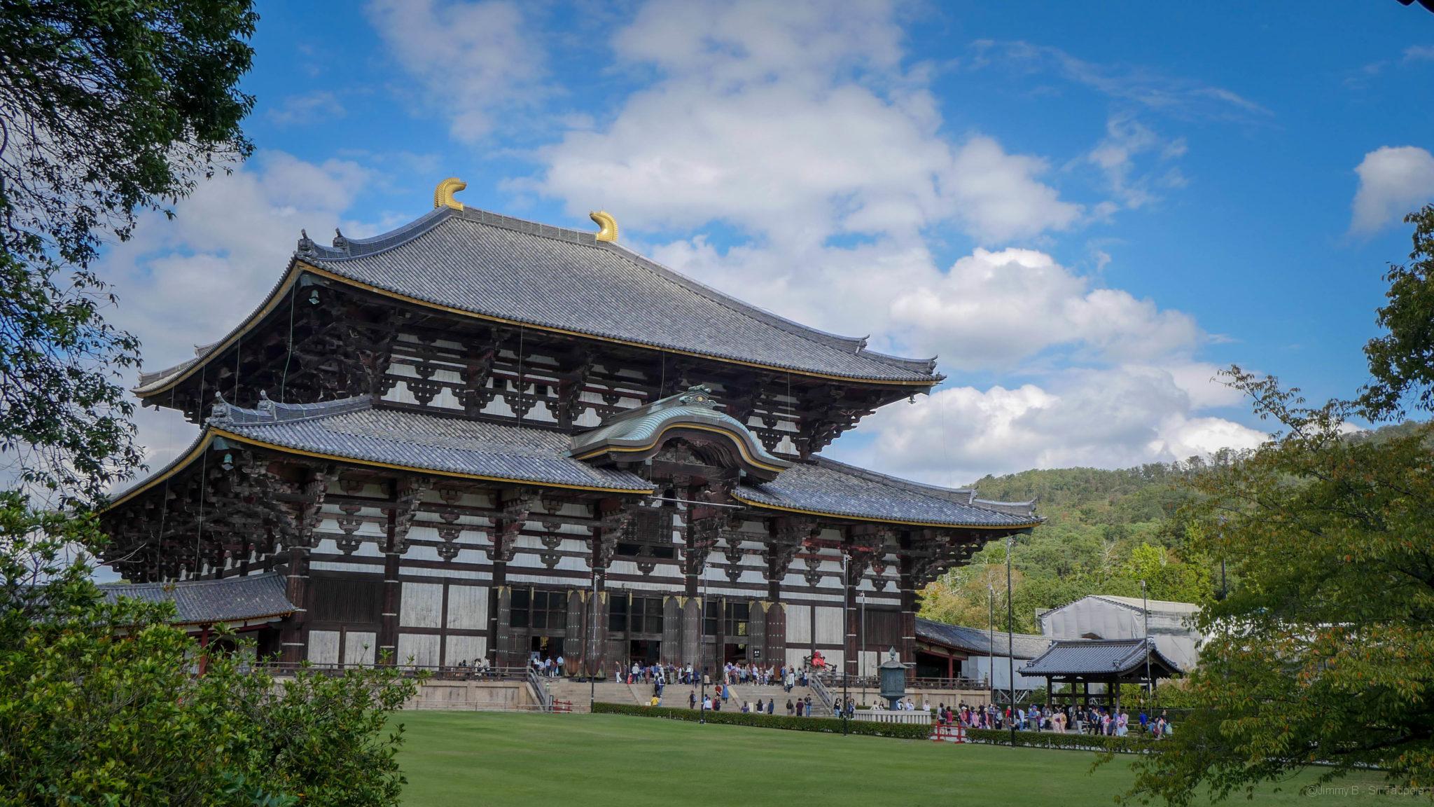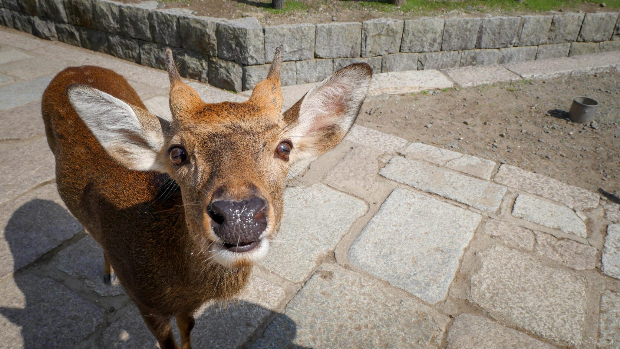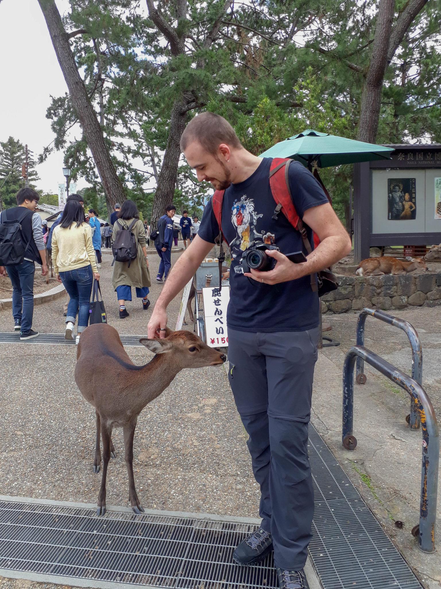 Nous continuons notre route dans le parc et nous rencontrons les premiers daims. On décompte dans le parc près de 1200 daims habitués à l’homme, tellement que quelques commerçants ambulants proposent des biscuits à leur donner. Jimmy a tenté d’en caresser un mais il aurait préférée un biscuit. La balade continue pour trouver le temple Todai-ji.