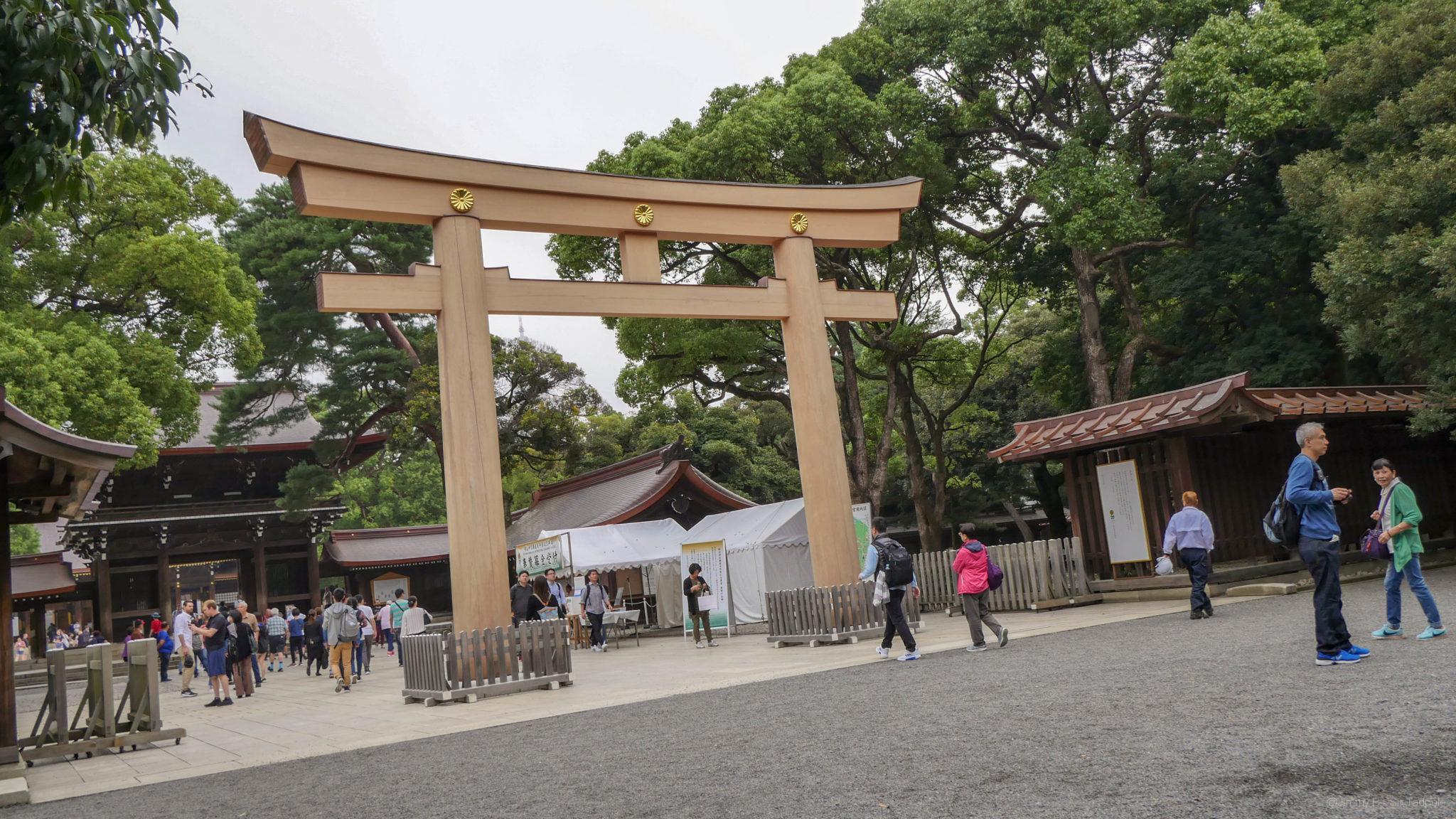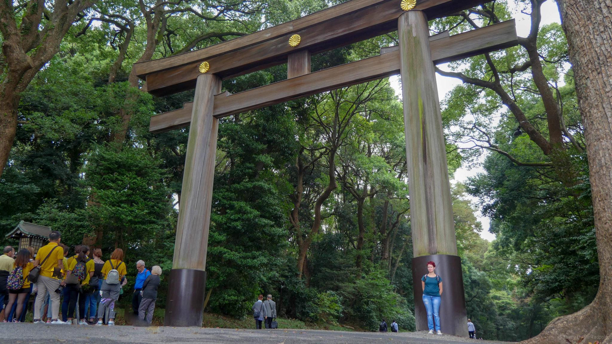 Première visite de la journée au temple Meiji Jingu, temple aux immenses « TORI » en bois, les plus grands du monde. Cette balade est une fracture dans le temps, une fracture avec la ville. Alors que nous avançons dans l’énorme allée qui mène au temple, le calme s’installe autour de nous. Tout nos sens se mettent au repos, loin des lumières et des bruits de Tokyo.