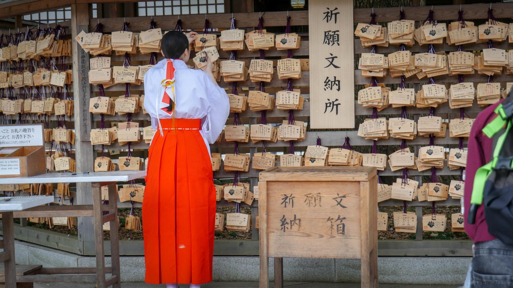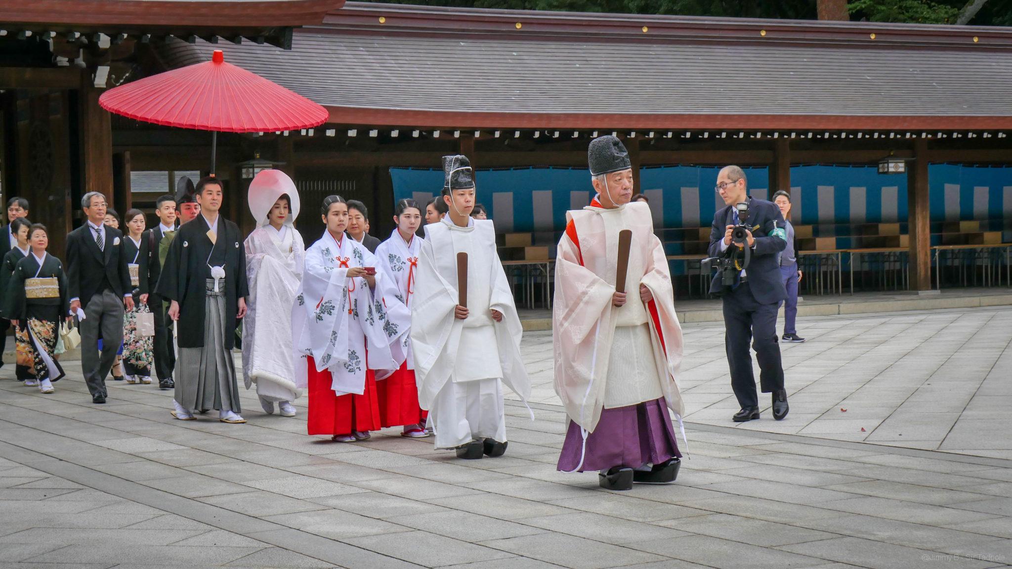 Après un passage à la purification du corps, nous entrons dans le temple où une belle surprise nous attend, la sortie d’un mariage Shintoïste. C’est un spectacle qu’il est assez rare à voir en semaine, nous sommes chanceux !